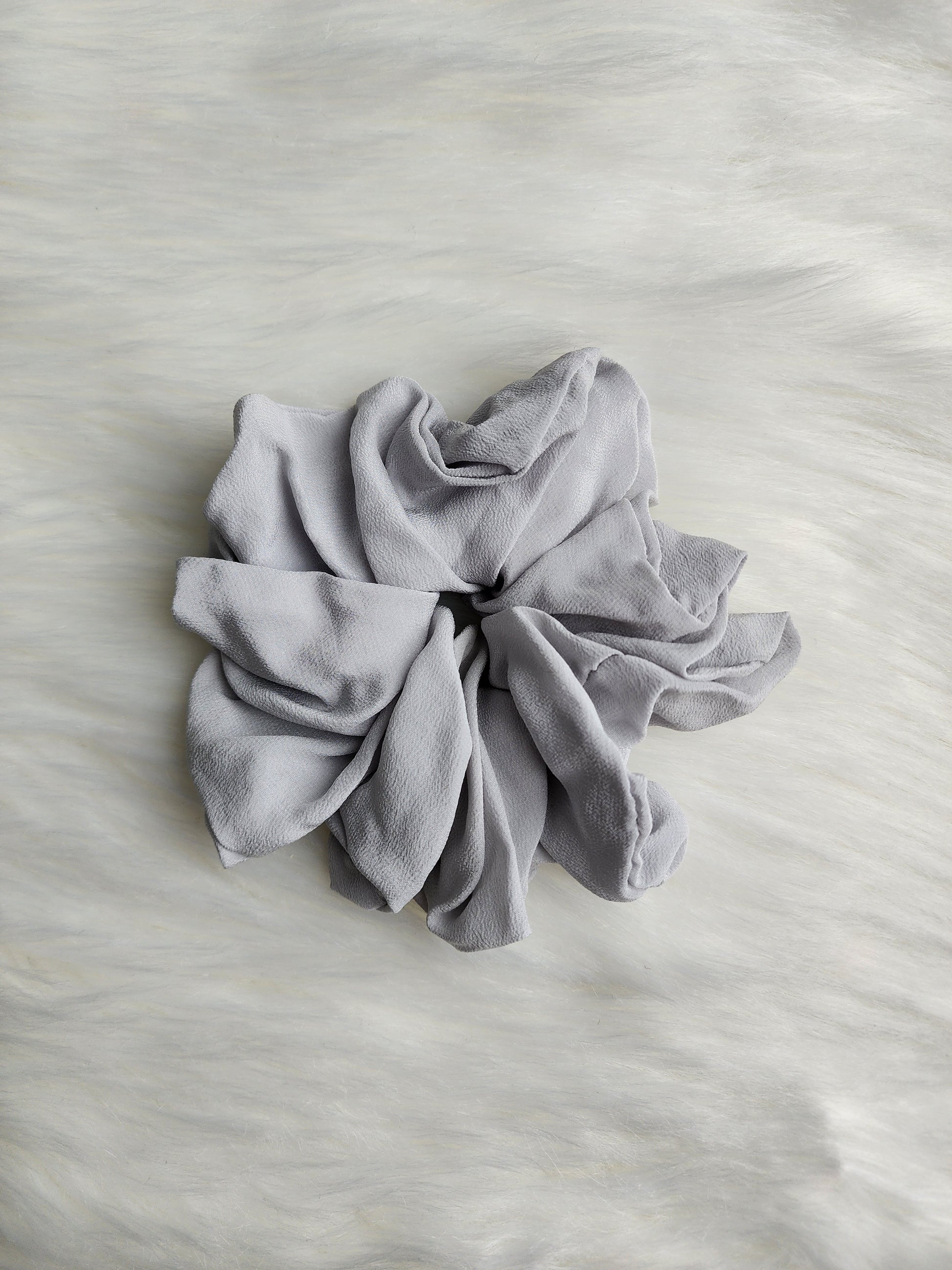 A classic grey chiffon scrunchie made from upcycled textiles.