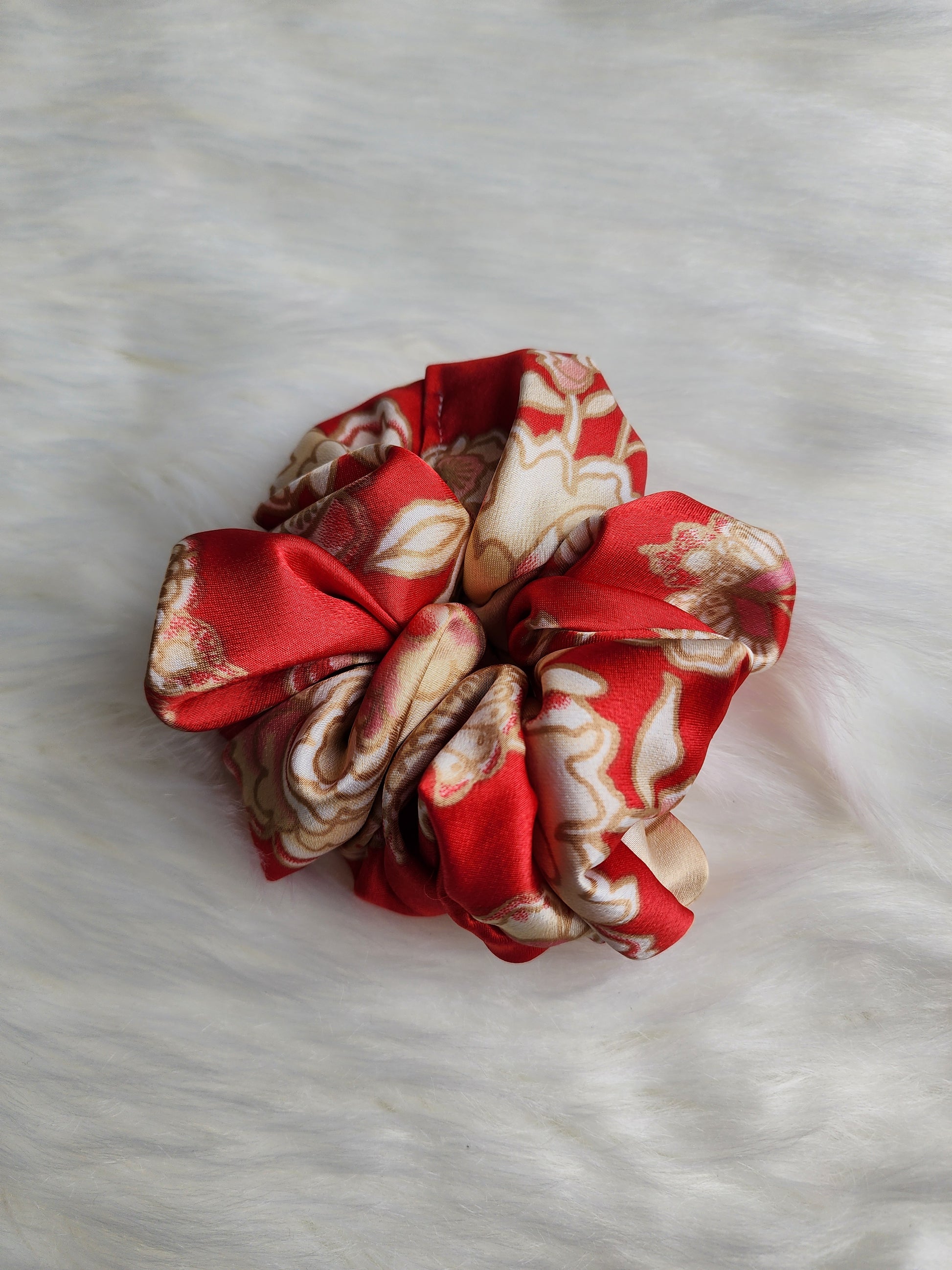 Each scrunchie is one of a kind is made from a red satin floral fabric.