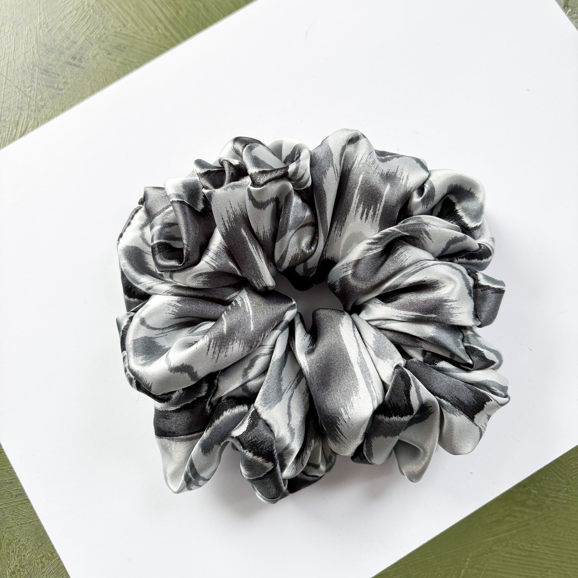A beautiful satin scrunchie made with a tie dye patterned grey preloved fabric.