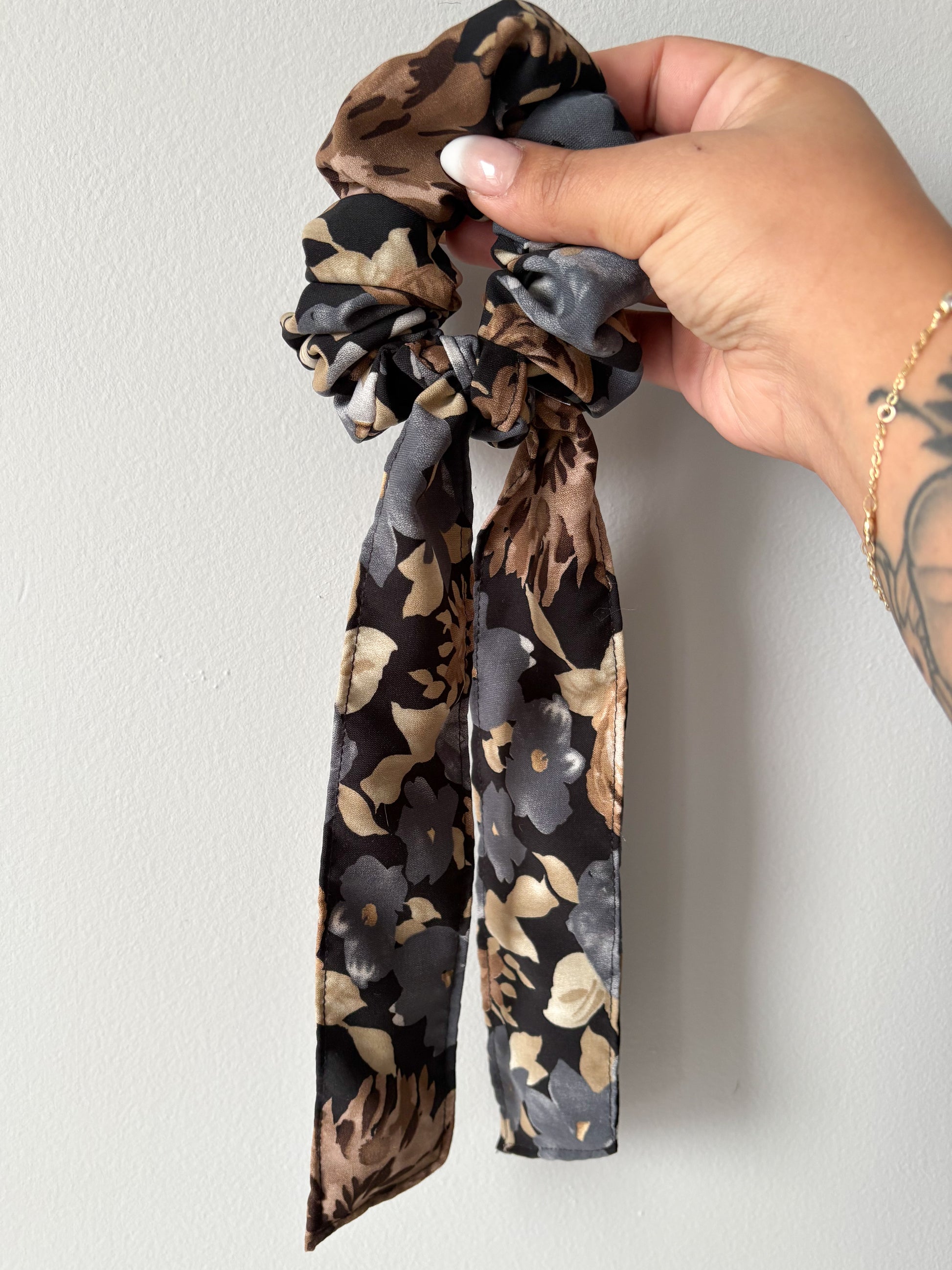 A dark floral patterned bow scrunchie.