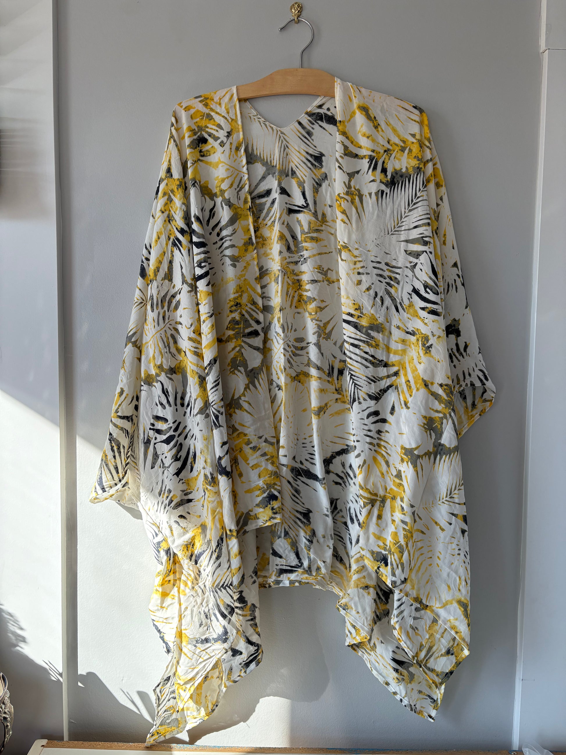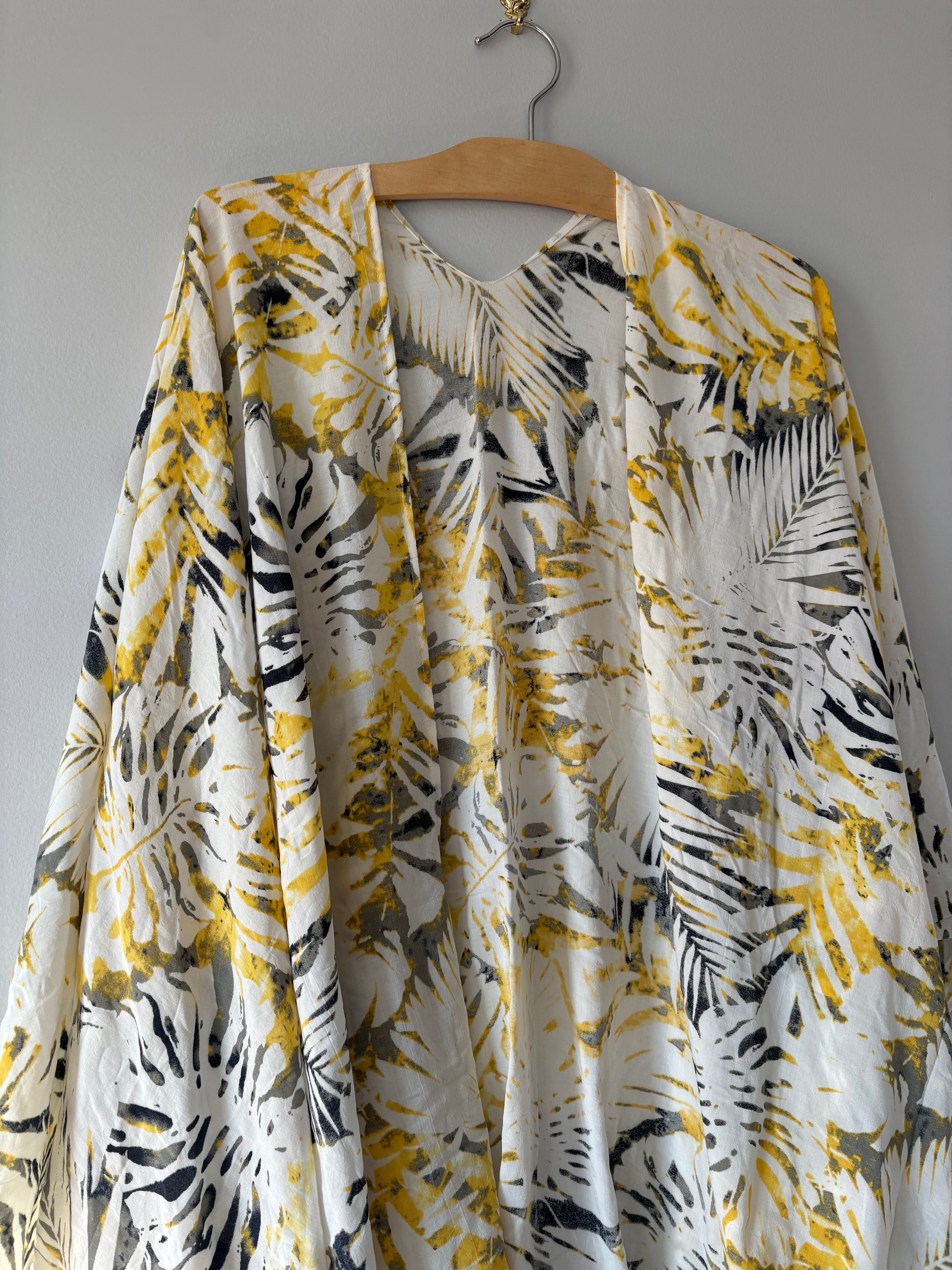 A beautiful bright coloured kimono decorated with a subtle leaf pattern in yellows and greys on a white background.